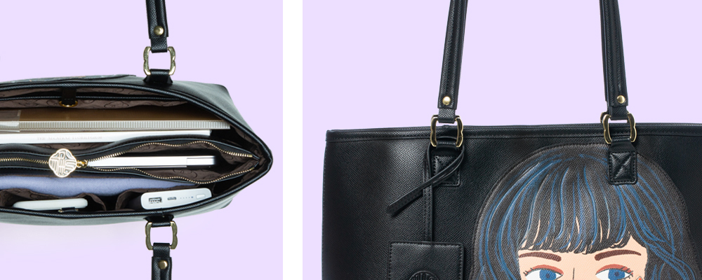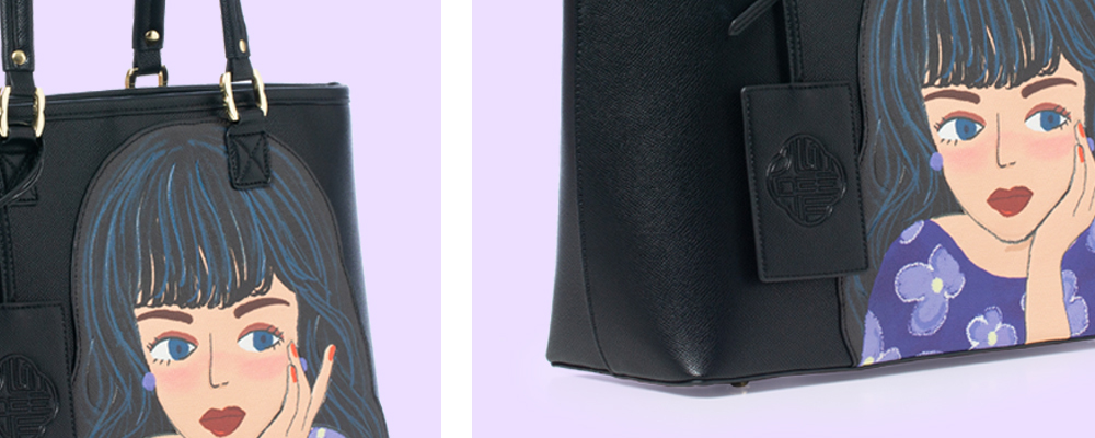 以品牌創立人形象繪製的心晴娃娃為設計主軸,採用立體凹凸壓紋加上多彩噴印,凸顯出製包的精緻工藝。