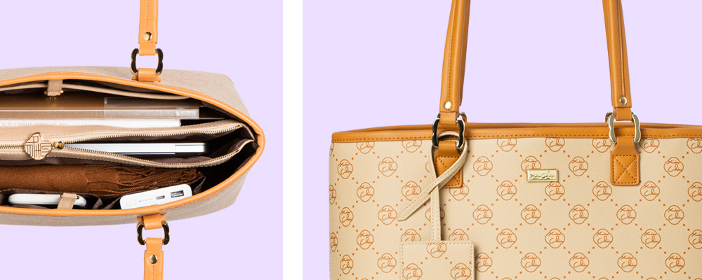 心晴經典印花,搭配深淺焦糖咖啡配色,加上淺金色金屬配件裝飾,內藏獨家專利設計USB線及13"筆電防撞內袋,除便於收納外,更考慮到每個細節和多功能性。
